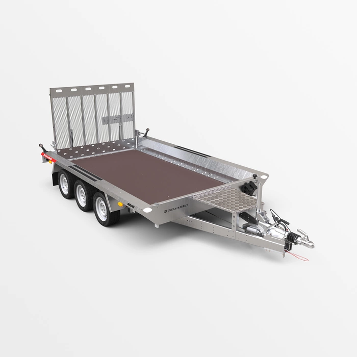 Robust welded trailer for transporting construction machinery and very heavy materials. The original design gives the possibility of walking on the entire length of the sides equipped with anti-slip strips. Welded load-bearing frame made of closed steel profiles. Floor made of waterproof anti-slip plywood equipped with solild floor brackets for cargo fastening to ensure the safety of transported goods. Extra sturdy V-type drawbar and supports to stabilize the overrun. Bucket support and support wheel with automatic folding as standard. Springs for easy lowering and raising of the overrun. Possibility of replacing the wide overrun ramp with two overruns reducing the weight of the trailer and thus increasing its payload capacity.